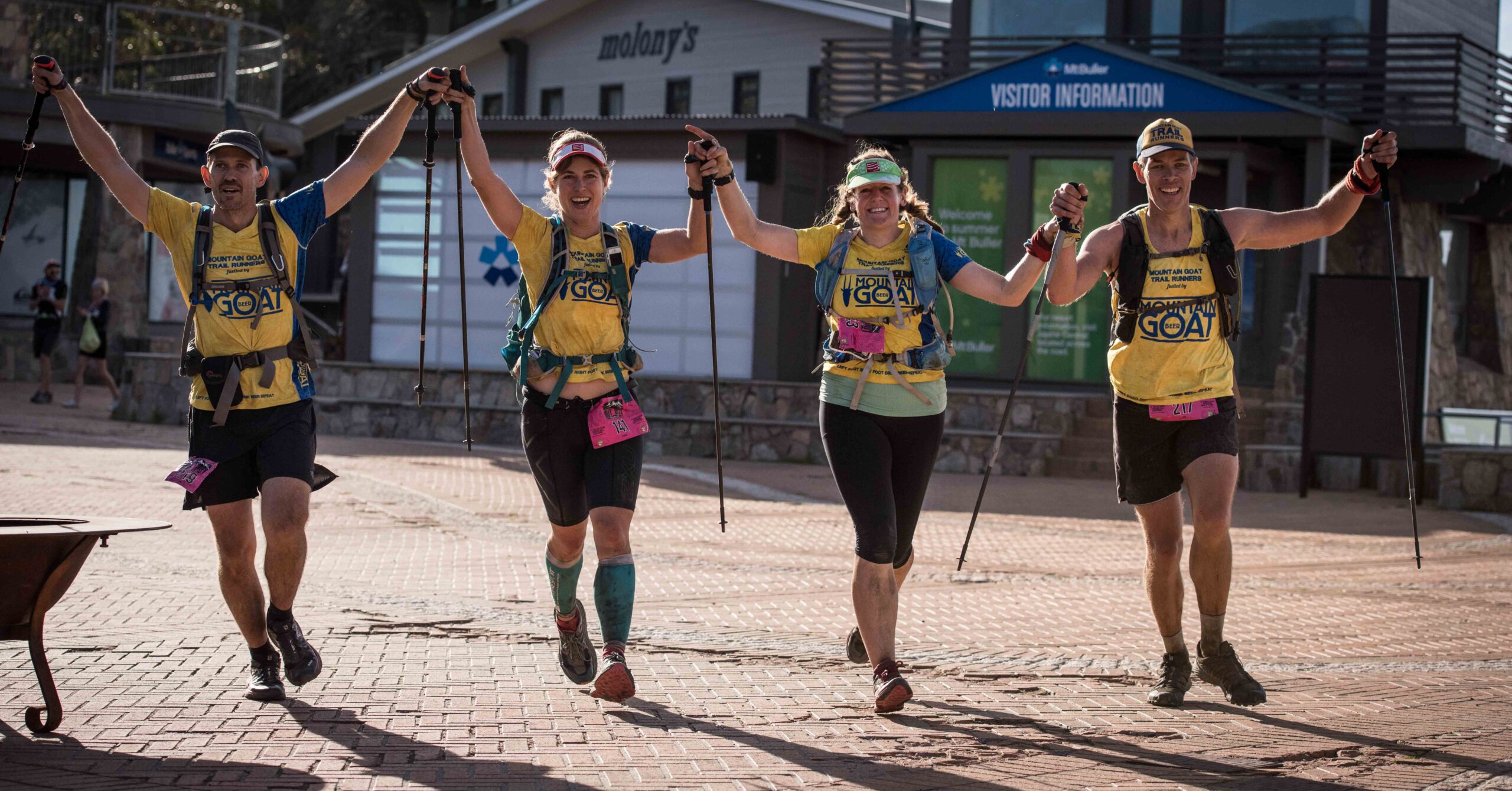 I just wanted to get down the hill and across the finish line! And that we did, we stumbled down the steepness of Mt Buller, hit the township, and with the last couple of hundred meters we all turn on the pace, the smiles the and complete satisfaction of finishing as a team, and all running arm in arm!