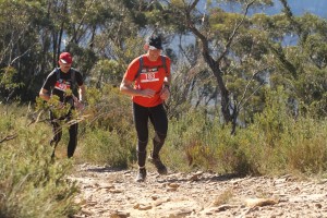 Starting the race at 7.15am (bit late due to shuffling from the event briefing to the start line) we were all in good spirits, everyone was feeling good, waving at all the cameras and we were off. The first 1.5 kms was road, and a good chance to warm up, as it was quite chilli. Then we hit the first off road section, a single trail for about 900m, it seemed to go forever, as we were near the back of the competitors† and it was a slow single file to get through this section. Considering we still has a long way to go, we didn’t mind walking abit. After the first section of track, it was a good section to warm up again, so we broke into a decent pace and got into it. At this point we waved good bye to Tim, and Pete and I continued at our slightly faster pace. The next track section reminded me of the awesomeness of this event, right from the moment of entering the track, we were presented with the magical Blue Mountain views and scenic shots. A tad difficult to stop and enjoy the scenery as you are also watching where you are running, but a very enjoyable section. The leg concluded with a long set of stairs to the top of the Golden Stairs. There was a lot of struggling runners going up this set, and everyone’s joy and spark was soon diminished, as we realised that we still had a lot of hills and distance to go.