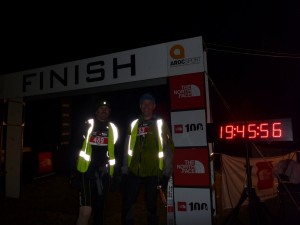 The finale leg, with time running short to get over the finish line in 20hours, we knew we had to keep a reasonable pace and we would be fine. This section was initially roads, then a decent down through Wentworth Falls and back out again. Finally when we think we are near finished, we realise that there is another drop into the bush. Pete was finding the downhill section a killer on his knees, so we decided that with 15 mins to go (before it was 20hours), and 2km to go, I would go solo and try to make the 20 hours. With a new burst of energy, I ran the last 2kms probably the fastest that any other section. It was uphill, but with my watch telling me I was cutting it very fine, I was not going to miss the 20 hour mark. So approaching the finish line through the “The North Face” flags I finished in 19.39.51 hours! I think the time was adjusted slightly due to the late start, and my watch was out of sync). Finally sitting down to grab a drink, and take the pack off, having a stretch and to celebrate with another runner who had just finished. The crowd was limited at 3am in the morning for some reason? Soon after I caught my breath, a tap on the shoulder revealed it was Pete – with a time of 19:42:32. I was in complete shock to see him so soon! It’s amazing how your body can turn on when it has to, and you have a goal so close in front of you. Awesome result all round, and after a bit of celebrating (also collecting my Belt Buckle), it was time to hit the sack.