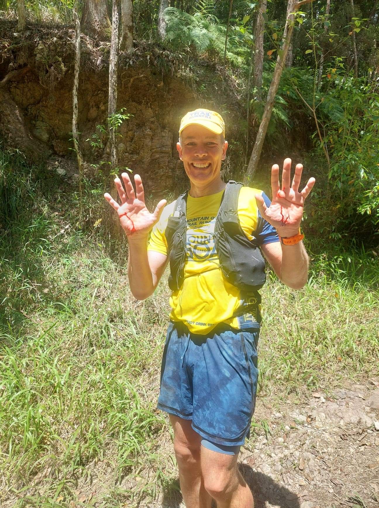 At about 35km was a nice downhill firetrail – and after a quick check of my watch (at pace), I tripped and landed pretty heavily on my hands and hip. After a minute or so – I was running again, but taking it abit easier (and feeling some new pains)