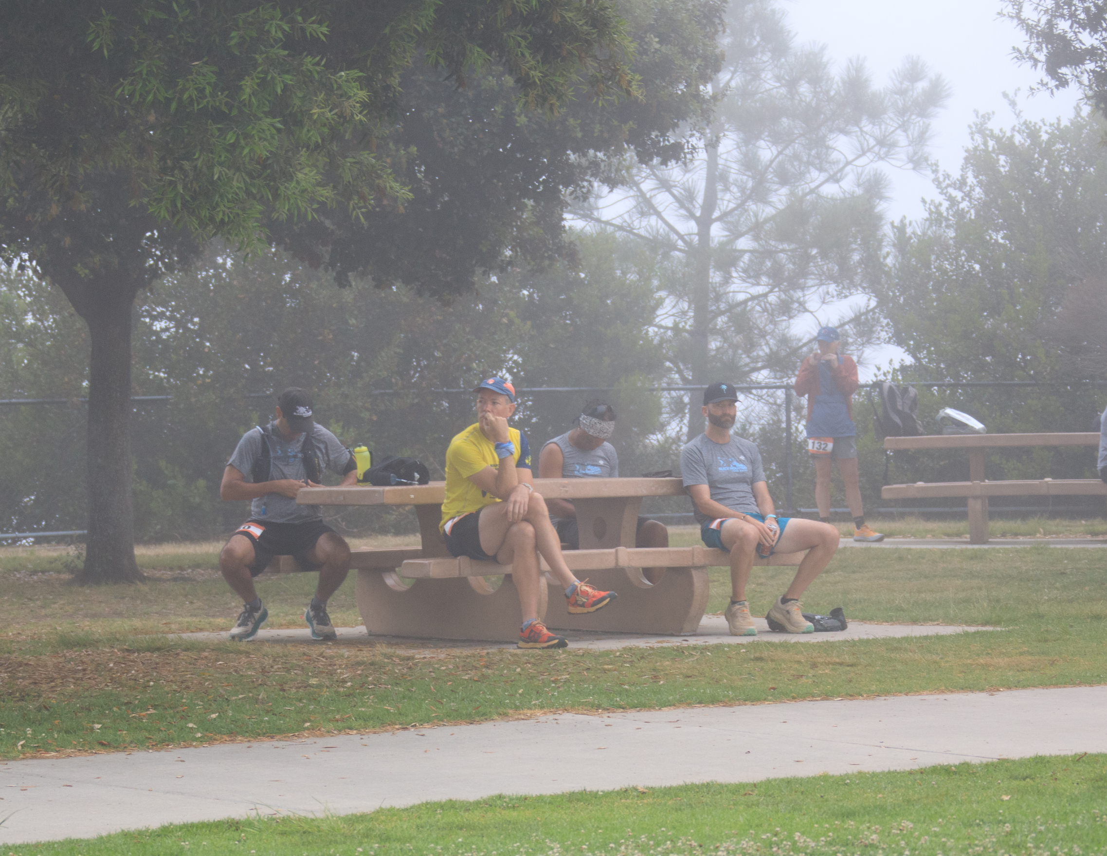Usual Pre-event warm up routine captured here. Also a photo to appreciate the early morning fog that was unusual, given in San Diago the weather had been had been so clear – although we ere at some altitude.